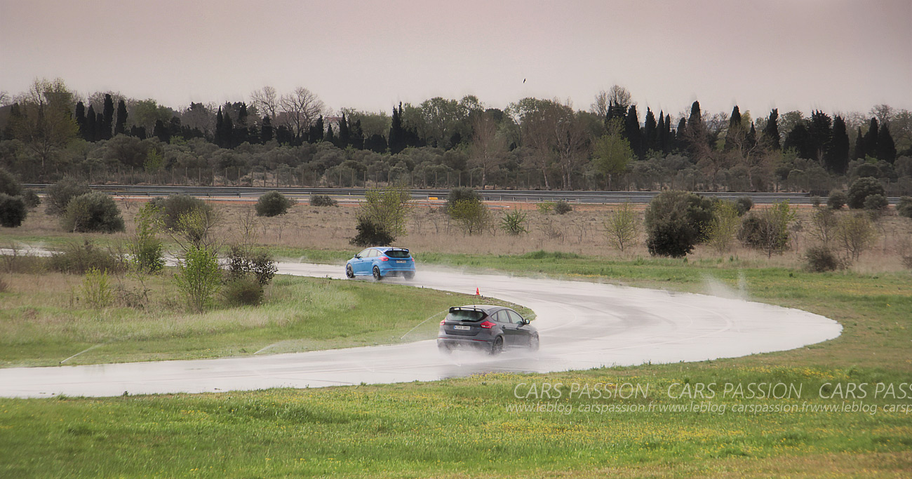 Le rythme s’est accéléré au fur et à mesure que nous faisions connaissance, elle n’est pas en reste la chipie, et dans une atmosphère tellement sécurisante, je vous avoue que je n’ose même pas regarder le compteur mais je m’aperçois qu’il n’y a qu’un motard, en combi qui me suit depuis une bonne dizaine de kilomètres, ce qui est incroyable, c’est que la miss ne nous met à aucun moment en défaut. Bon je vous rassure, nous sommes sur route ouverte donc pas de folie non plus sachant qu’une session circuit nous attendait le lendemain, mais deux autos écoles se souviennent encore du refrain de notre Focus RS dans les montagnes.