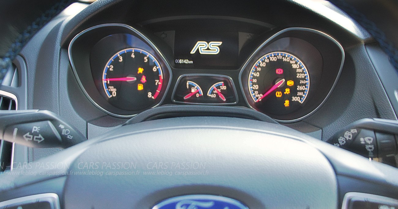 Avant de prendre le volant, on va faire un petit tour de la voiture, Pu*** quelle gueule, encore plus agressive que la ST (évidemment vous me direz), des bas de caisses cohérents avec le style de la voiture, des jantes superbes (jantes forgées optionnelles avec Pilot Sport Cup2 de chez Michelin) des ouvertures plus béantes dédiées au refroidissement moteur et freins avec une grille de calandre en nid d’abeille plus fine et de ce fait plus agressive, la vision de ce popotin massif et ferme éveille mon instinct d’homme, ce grand diffuseur orné de ces deux grosses sorties d ‘échappement et ce feu de brouillard trônant en son milieu type F1, et enfin la touche finale, ce becquet surplombant cette vision d’ensemble dès que vous vous ferez dépasser vous ne pourrez que le constater, cette Ford Focus est une réussite visuelle. Je n’ai qu’une envie, prendre le volant pour savoir ce qu’elle a dans le ventre.